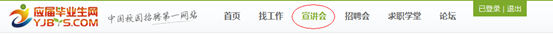 YJBYS宣講會(huì)查詢系統(tǒng),就是YJBYS求職網(wǎng)提供的查詢?nèi)珖?guó)校園宣講會(huì)信息的實(shí)用工具,使用這個(gè)系統(tǒng),同學(xué)們可以輕松地查詢到某段時(shí)間內(nèi)全國(guó)有哪些名企會(huì)在哪些高校舉辦校園宣講會(huì)。查詢系統(tǒng)使用方法如下: