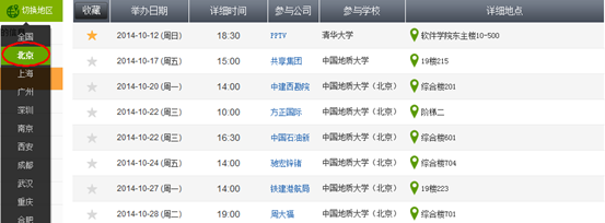 ②如果你希望了解某個(gè)城市發(fā)布的宣講會(huì)信息,你可以在界面的左邊導(dǎo)航欄中選擇切換地區(qū),選擇其中任何一個(gè)城市,你將會(huì)查到該城市所有已發(fā)布但是還未過期的宣講會(huì)信息,例如選擇北京,你將會(huì)得到北京地區(qū)企業(yè)發(fā)布的信息。