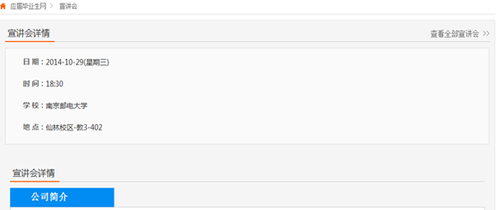 即可進(jìn)入公司的宣講會(huì)詳情內(nèi)容頁(yè)面,你可以從該頁(yè)面獲取到該場(chǎng)宣講會(huì)的所有必要信息。如點(diǎn)擊南京郵電大學(xué)或右邊的查看詳情,可以看到下圖的頁(yè)面: