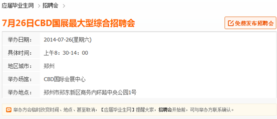 第三步:如果你希望找到某一天同時舉行的招聘會信息,你可以在舉辦日期那里選擇舉辦日期,例如選擇2014/7/26,你將可以得到26號當(dāng)天舉行的所有招聘會信息,結(jié)果如下: