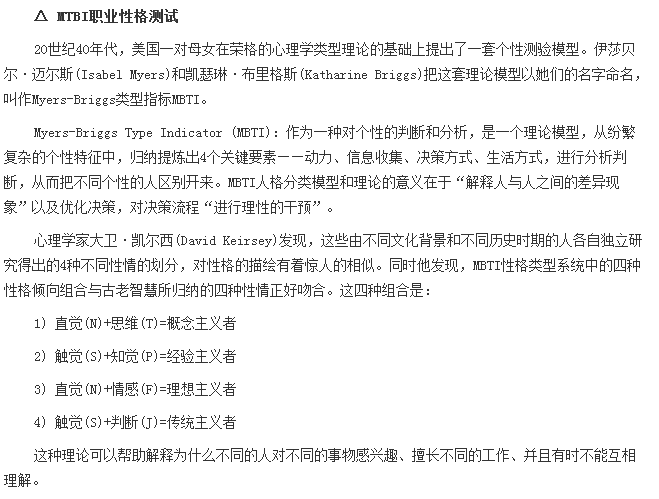 每個人從小到大都會積累這些自我認識,別人的一句話評論,老師對你作文的評語都是你認識自己的途徑。專業(yè)認識自我的方法有很多,世界上幫助人們對自己進行客觀的自我評估的方法有很多,如心理測試,應(yīng)用韋氏量表、瑞文智力測驗智商,卡特爾的16PF的人格測試都是具體應(yīng)用。其中國際上最為流行的職業(yè)人格評估工具莫過于MTBI職業(yè)性格測試了。