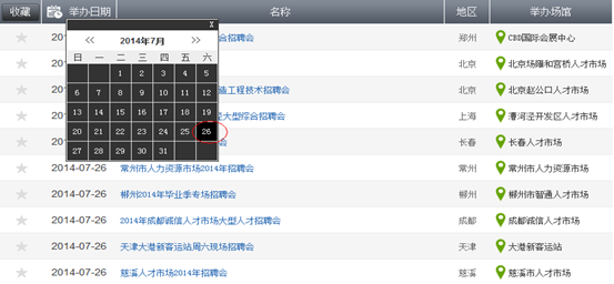 第三步:如果你希望找到某一天同時(shí)舉行的招聘會(huì)信息,你可以在舉辦日期那里選擇舉辦日期,例如選擇2014/7/26,你將可以得到26號(hào)當(dāng)天舉行的所有招聘會(huì)信息,結(jié)果如下: