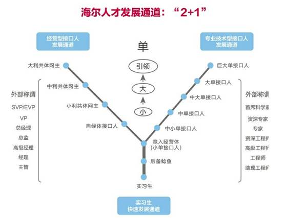 海爾集團(tuán)為員工規(guī)劃了雙通道(管理通道+專業(yè)通道)職業(yè)發(fā)展模式,并通過(guò)縱向職業(yè)晉升、橫向職業(yè)轉(zhuǎn)換為員工提供多重職業(yè)發(fā)展機(jī)會(huì),使員工的職業(yè)生涯更大限度的與集團(tuán)的發(fā)展保持一致。