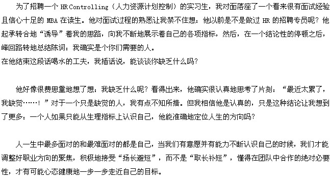 我很喜歡她的熱忱和誠懇的態(tài)度,但是更清楚地感受到了態(tài)度有時不能彌補(bǔ)方法上的缺憾,沒有很好的傾聽習(xí)慣和適度的確認(rèn)方法,在面試的過程中,很容易失掉不該失去的分?jǐn)?shù)。