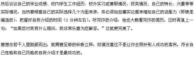如無(wú)意外,面試官的視線會(huì)從簡(jiǎn)歷移到你身上,然后點(diǎn)點(diǎn)頭示意你可以開(kāi)始,這時(shí)別忘了我上述的兩大武器——望著對(duì)方,微笑地說(shuō)聲謝謝,然后開(kāi)始介紹自己的學(xué)校、專業(yè),主修學(xué)科的研究方向,再表明自己強(qiáng)烈的就業(yè)意愿:我很希望能成為貴公司的一份子,并能為它的發(fā)展略效綿力。