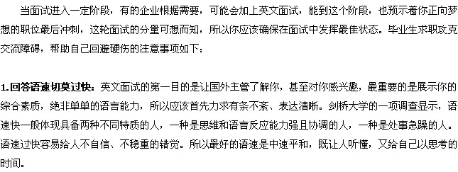如果前面都很順利,最后一輪面試一般就是和公司的總裁面對面了。外企的總裁一般是老外,當(dāng)然面試就變成全英語的了。面試在求職過程中,可以說是壓力最大的一個環(huán)節(jié)。而英語面試又是比較難的一環(huán),第三輪當(dāng)然是難上加難?偛迷儐柕膯栴}一般會和公司精神、企業(yè)文化、個人品質(zhì)、福利薪水有關(guān)。面對外國老板連珠炮似的提問,如果能回答得從容不迫、簡明扼要,恰當(dāng)中肯,合乎口味,那么肯定會大大增加你的錄取機會。