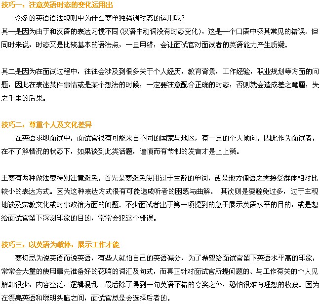 很多畢業(yè)生都有這樣的經(jīng)歷,當(dāng)進(jìn)入面試階段有可能會(huì)遭遇英文面試,不過(guò)這也預(yù)示著你夢(mèng)想的職位正向你招手,這輪面試的份量可想而知,所以你應(yīng)該確保在面試中發(fā)揮最佳狀態(tài)。英文交流無(wú)障礙的應(yīng)聘者為數(shù)不多,大多數(shù)人都處于有一定交流基礎(chǔ)、但經(jīng)驗(yàn)不足的水平,現(xiàn)在介紹一些面試中的技巧及例子,希望幫助英文水平并不是特別出眾的你。